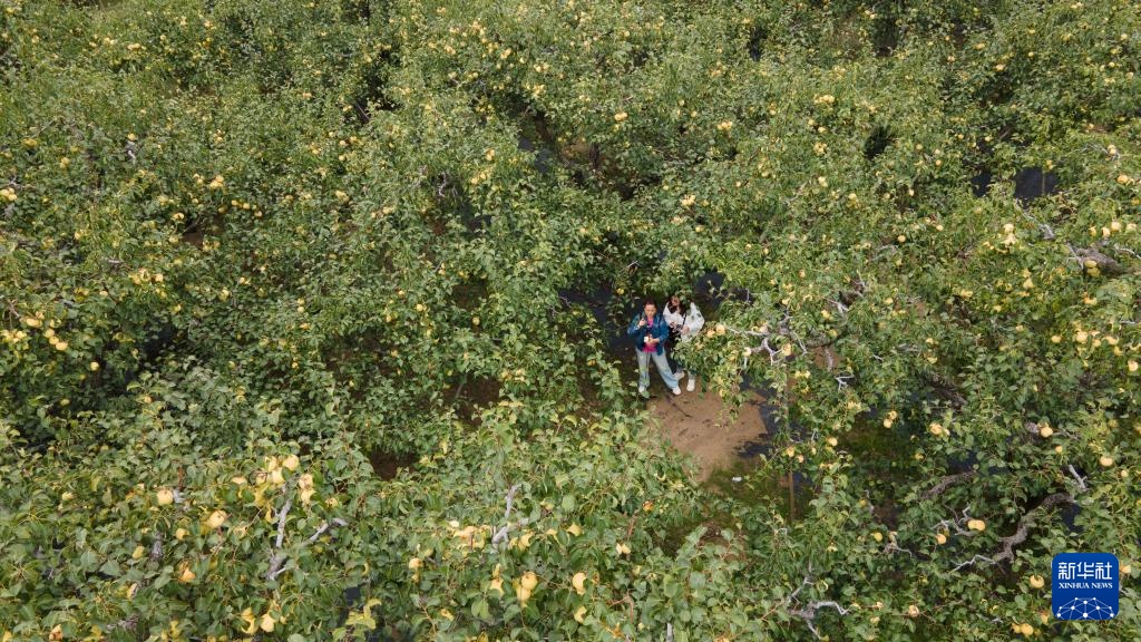 9月18日,游客在安徽省宿州市碭山縣一處梨園內參觀游覽(無人機照片)。新華社記者 張端 攝