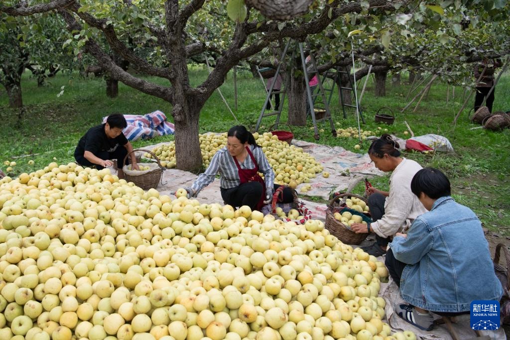 9月18日,在安徽省宿州市碭山縣一處梨園內,梨農在分揀酥梨。新華社記者 張端 攝