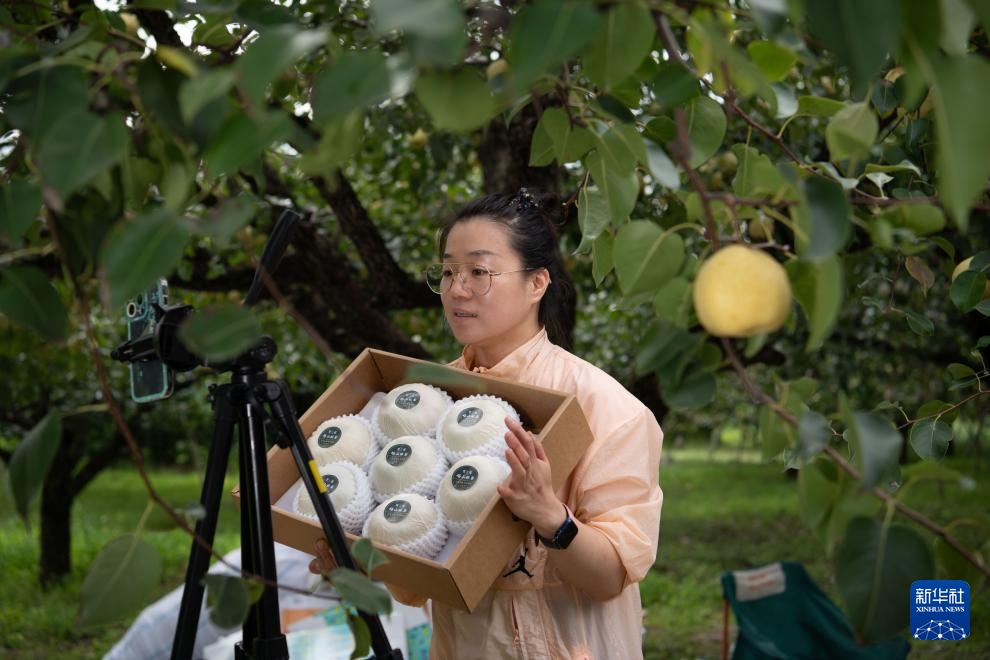 9月18日,在安徽省宿州市碭山縣一處梨園內,創業青年李貝通過視頻直播的方式銷售酥梨。新華社記者 張端 攝