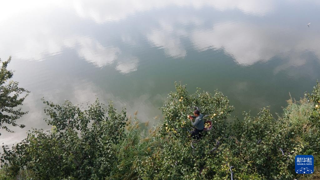 9月20日,在安徽省宿州市碭山縣一處梨園內,梨農在采摘酥梨(無人機照片)。新華社記者 張端 攝