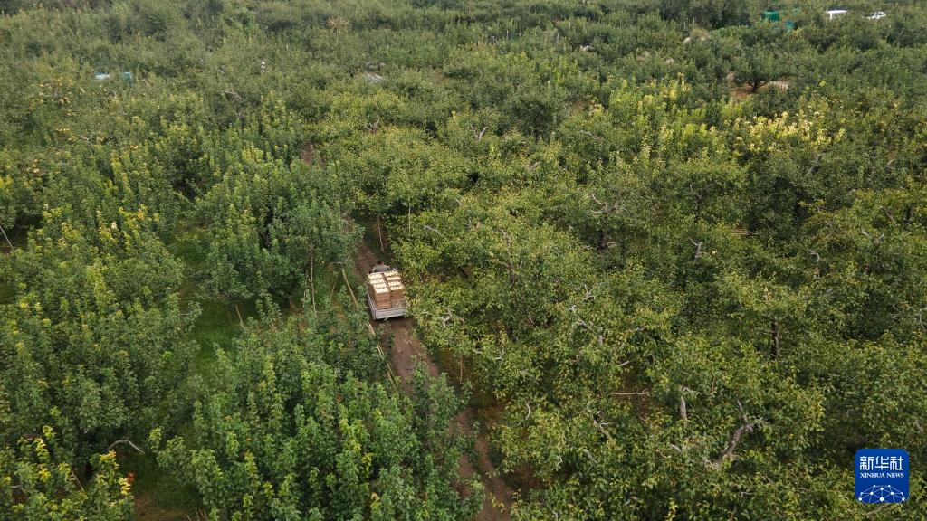 9月20日,在安徽省宿州市碭山縣一處梨園內,梨農在轉運裝車的酥梨(無人機照片)。新華社記者 張端 攝