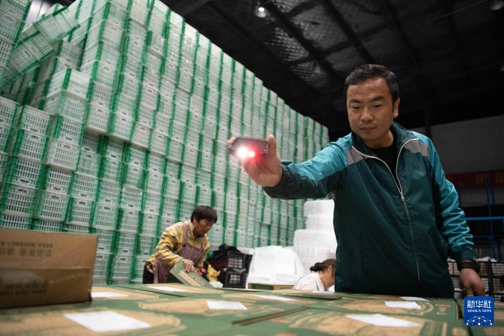 9月19日,中國郵政集團有限公司安徽省碭山縣分公司工作人員(前)將需要寄遞的酥梨掃描錄入系統。新華社記者 張端 攝