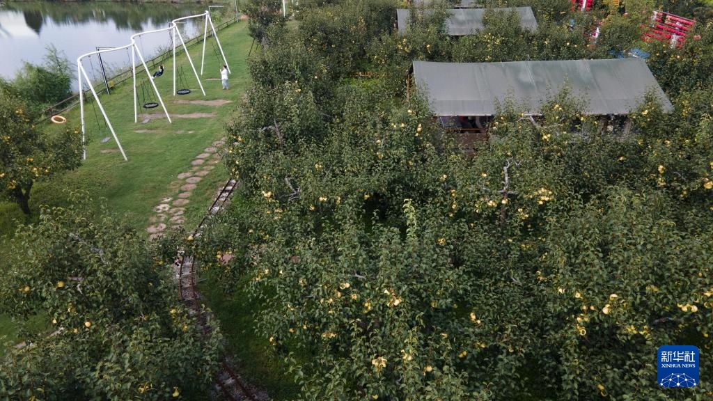 9月20日,在安徽省宿州市碭山縣一處酥梨文化主題樂園內,家長和孩子在休閑游玩(無人機照片)。新華社記者 張端 攝