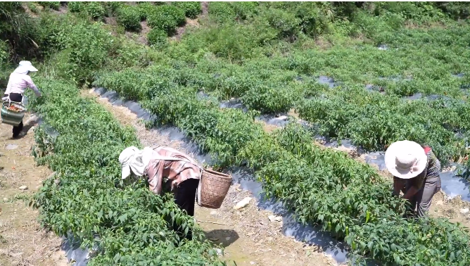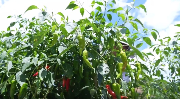 當地村民告訴筆者,獨特的高山氣候和土壤條件,孕育出的辣椒肉質脆嫩、辣中回甜,深受市場青睞。通過多茬采摘,辣椒的收獲期可持續到中秋節左右。“這個辣椒的口感,帶一點辣味,條形比較好,皮也比較薄,肉也比較脆。”蔣勝取笑著說道,“吃起來有一點微甜,可以做辣椒醬、腌辣椒、干辣椒。”