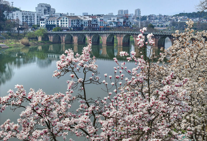 這是2024年3月12日在安徽省黃山市歙縣新安江畔多景園拍攝的玉蘭花(無人機照片)。新華社發(施亞磊攝)