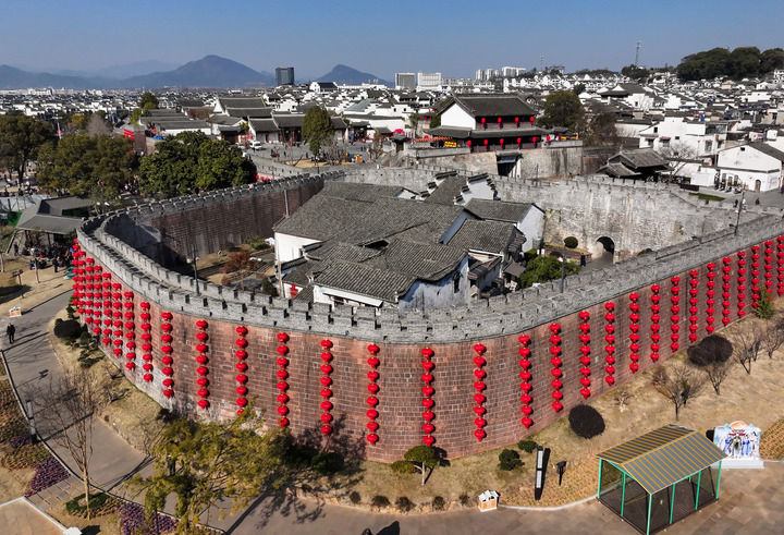 大紅燈籠扮靚徽州古城(2024年1月25日攝,無人機照片)。新華社發(施亞磊攝)