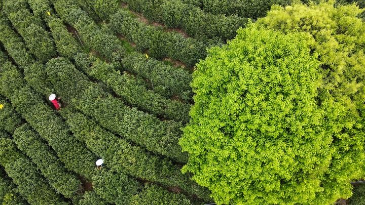 2024年4月10日,黃山市祁門縣歷口鎮的茶農在采摘春茶(無人機照片)。新華社記者 張端 攝